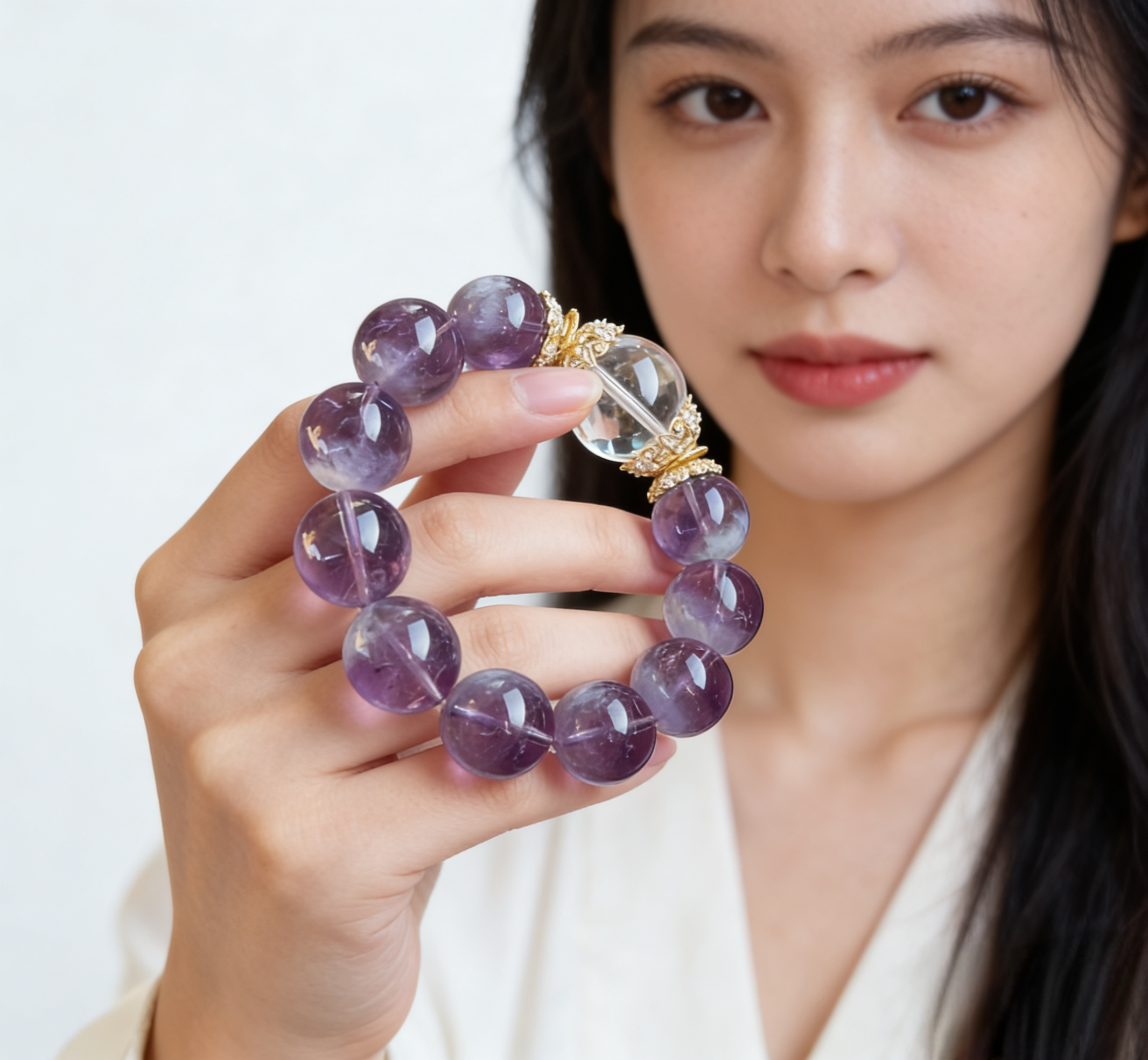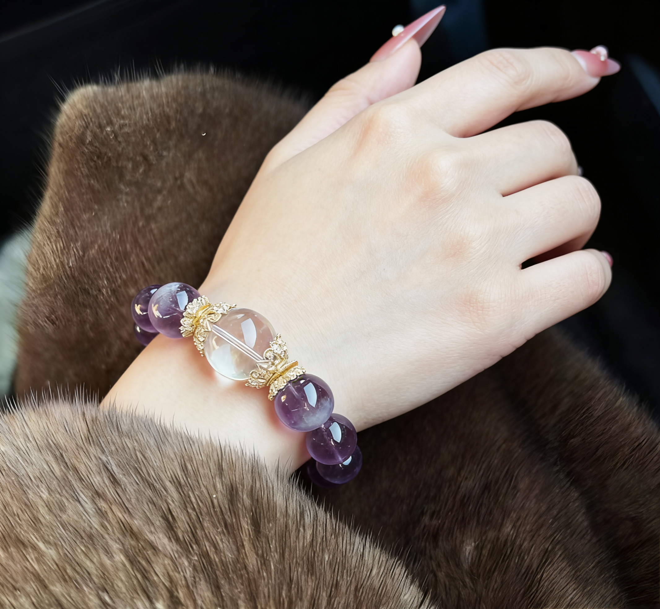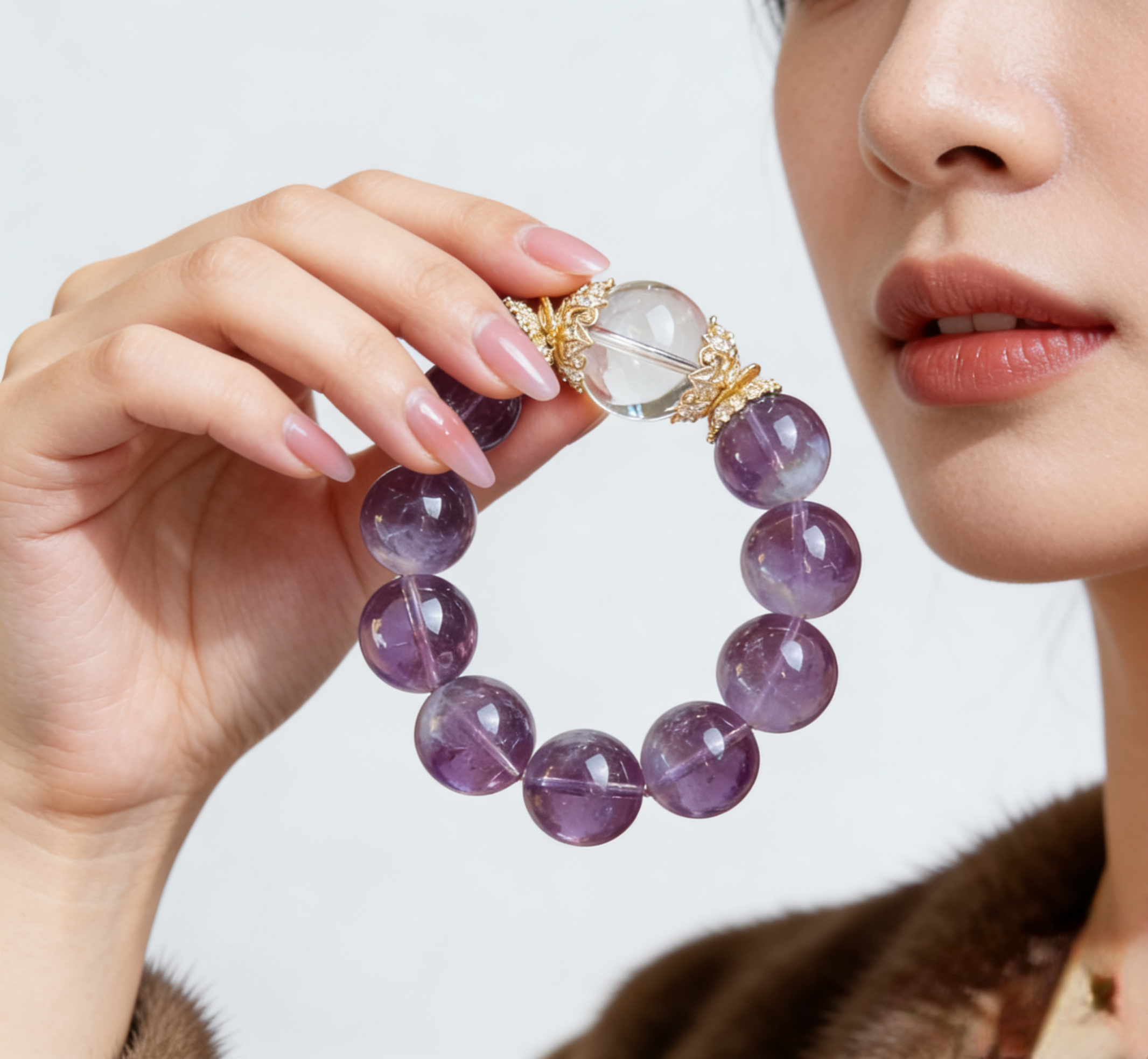 煙紫漸變的天然紫水晶,像把暮春的紫霧揉進了腕間,清透瑩潤,每一顆都帶著獨屬於水晶的溫柔光暈。